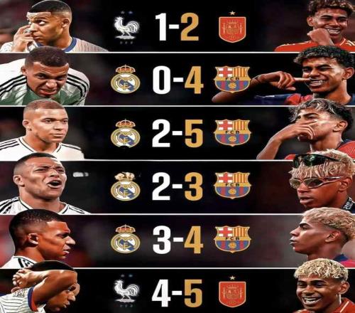 在此前的6次交锋中,亚马尔所在的俱乐部和国家队均战胜姆巴佩的球队。