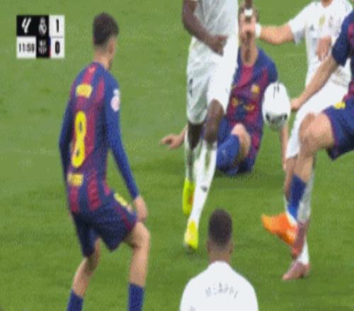 第12分钟,VAR介入之后再度做出了改判:姆巴佩外围直接一脚外脚背爆射入网,皇马全队疯狂庆祝,随后主裁判听从视频裁判的意见之后,示意姆巴佩越位在先,进球无效,巴萨再度逃过一劫。