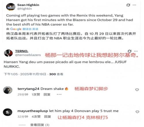 赛后,大批美媒和球迷都集体狂吹小杨,先是开拓者的跟队记者表扬杨瀚森说:“经过了发展联盟的锻炼,他很明显变得更加自信,更加适应了,之前不是真正的他。”、“杨瀚森的技术特点体现得非常明显,努力没有白费,他就是我们的下一个约基奇。”