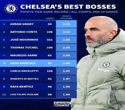 切尔西队史主教练各项赛事场均积分前10(至少执教20场):