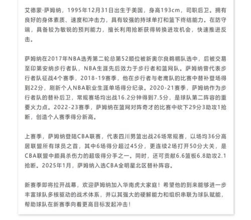 刚刚,广东队正式官宣CBA超级外援萨姆纳加盟,看到如此消息,广东队球迷也是十分激动,因为,这意味着,广东队云集了四名顶级外援。有球迷表示:广东队争冠的最后一块拼图完成了!第12冠马上就要来了,提前祝贺广东队……