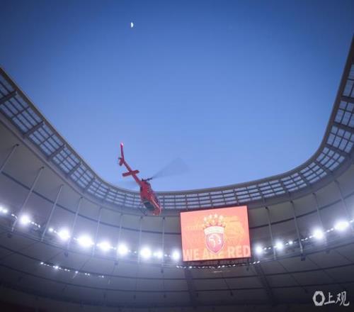 在总结会开始前,队长王燊超手捧火神杯乘坐直升机降落至球场中央,并由海港吉祥物“伊戈”接机至球场,王燊超高举奖杯与来到现场的球迷们一起庆祝冠军。
