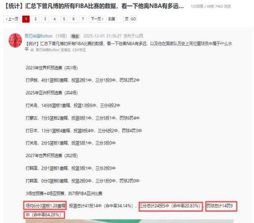 有球迷统计了曾凡博从2023年到现在打国家队比赛的数据,他一共打了3场世预赛+4场亚预赛,总共7场FIBA亚洲比赛,场均6分3篮板1.28盖帽,投篮总计41投14中(命中率34.14%),三分总计24投5中(命中率20.83%),罚球总计14罚9中(命中率64.28%)这样的数据真是太一般了,不知他哪来的底气天天想着去NBA打球,怪不得蓝网NBA中国赛不让他上场。