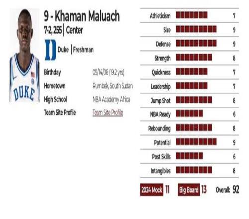 优点:出色的护框手和篮下终结者,一位聪明且易于教学的球员,在杜克大学大一赛季稳步提升,过去六个月他的体能和身体素质都有所提升,他是蓝魔队的防守支柱,防守存在感不仅体现在盖帽上,也体现在干扰投篮上,他拥有2米90的站立摸高、2米15的身高和2米31的臂展,展现出能 NBA赛场制造防守威慑的潜力,能有效影响对手的投篮命中率和进攻节奏,他拥有盖帽天赋,反应迅速,不易被假动作迷惑,作为一名中锋,他拥有比赛专注度和强烈的求胜欲望,攻筐效率极高,虽然其中很多都是空中接力扣篮,投篮命中率高达71%,在挡拆配合中展现出扎实的顺下能力,三分球16投4中,这令人鼓舞,但样本量太小,不足以得出结论,篮板能力出色,力量也不错,极具潜力,但如果在高顺位选中,风险也很大,需要赌他的进攻有很大提升空间,赌他能成为攻防两端都能做出贡献的首发球员,为人成熟稳重、品格高尚、聪明专注,这是他为何能在短时间内取得巨大进步的主要原因.