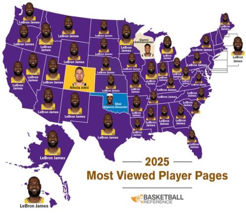 北京时间12月11日,据数据网站BBR显示,其网站今年在各州被浏览次数最多的球员页面分别是:詹姆斯(47个州)、亚历山大(俄克拉荷马州)、约基奇(科罗拉多州)、字母哥(威斯康星州)。加拿大也几乎都被詹姆斯占据。