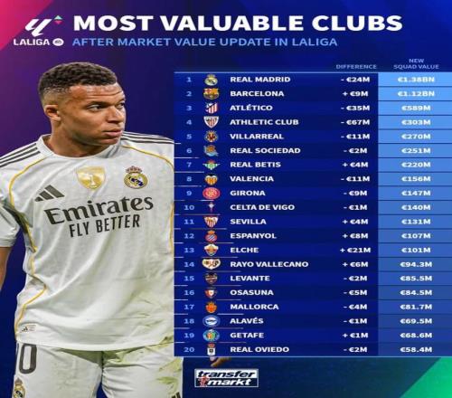 北京时间12月13日,在更新了西甲球员的身价之后,德转列出了西甲俱乐部最新的身价排行榜,皇家马德里以13.8亿欧元高居第一,巴塞罗那11.2亿欧元第二,马德里竞技5.89亿欧元第三。
