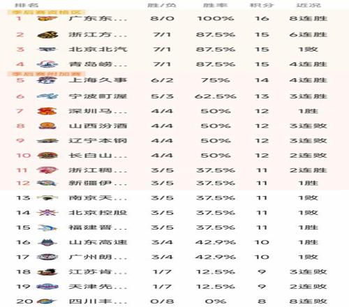 3胜5负的球队有5队,分别是浙江稠州、新疆、南京、北控和福建,暂列第11-第15名。浙江稠州87-73战胜南京迎来两连胜,整体的状态反弹。新疆昨晚在主场94-76战胜广州结束4连败,阿不都沙拉木发挥全面8投7中拿到了18分10篮板7助攻2抢断。山东和广州都是3胜4负暂列第16-第17,江苏和天津都是只有1场胜利,四川是唯一8连败垫底的球队!