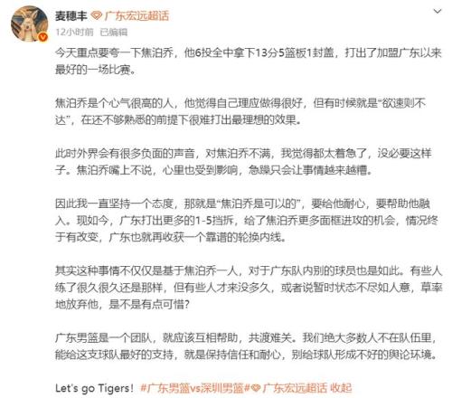 对此,广东篮球媒体人麦穗丰表示:“焦泊乔是个心气很高的人,他觉得自己理应做得很好,但有时候就是‘欲速则不达’,在还不够熟悉的前提下很难打出最理想的效果。”