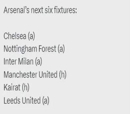 阿森纳未来6场比赛:客战切尔西、客战诺丁汉森林、客战国米、主战曼联、主战凯拉特、客战利兹联。