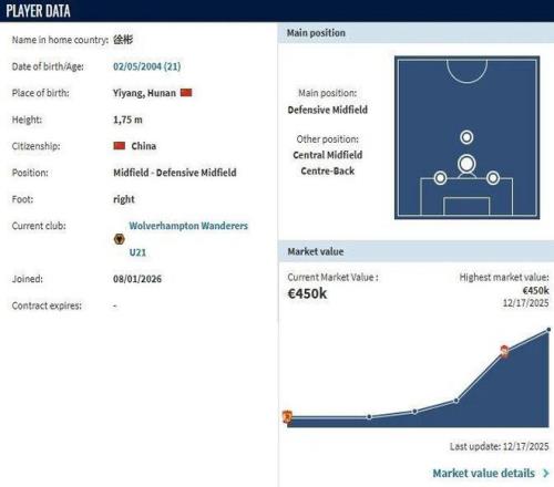 据红星新闻援引五星体育消息:德国转会市场更新信息,湖南伢子徐彬已成为英超狼队U21梯队的一员。徐彬司职防守型中场,也能胜任中前卫和中后卫,其45万欧元的身价也创下了个人职业生涯的新高。