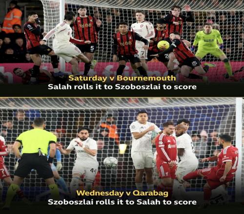 欧冠联赛阶段第8轮,利物浦主场对阵卡拉巴赫,下半场索博斯洛伊助攻萨拉赫破门,两人连续两场比赛通过战术任意球互相助攻。上周末英超客场对阵伯恩茅斯,在一次任意球进攻中,萨拉赫