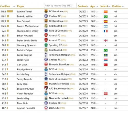 11月5日宣 今日,足球统计权威CIES发布了最新数据,列出了年龄未满20岁球员中预估转会费最高的榜单,其中四位球员的预期转会费均超过1亿欧元(包括附加条款,且为100%所有权)。巴萨的