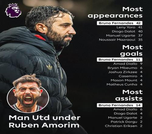 阿莫林执教期间,B费是曼联英超出场、进球、助攻最多的球员