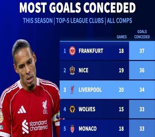 本赛季五大联赛失球榜:法兰克福37球居首,利物浦34球排第3