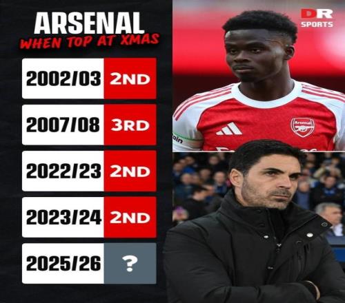 阿森纳第5次成为英超圣诞冠军