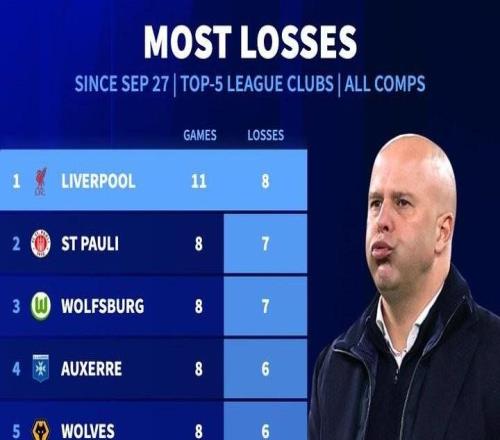 据德转统计,利物浦是自9月底以来五大联赛输球场次最多的球队,他们在11场比赛中输掉8场。自9月底以来五大联赛输球场数最多的球队TOP101-利物浦 11场输8场2-圣保利 8场输7场3-