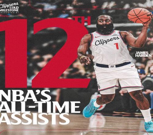 北京时间12月21日,NBA常规赛,快船主场对阵湖人。第三节比赛初,哈登助攻洛佩兹命中三分。这次助攻后,哈登的生涯总助攻数来到8525次,升至历史助攻榜第十二。来源:NBA官网